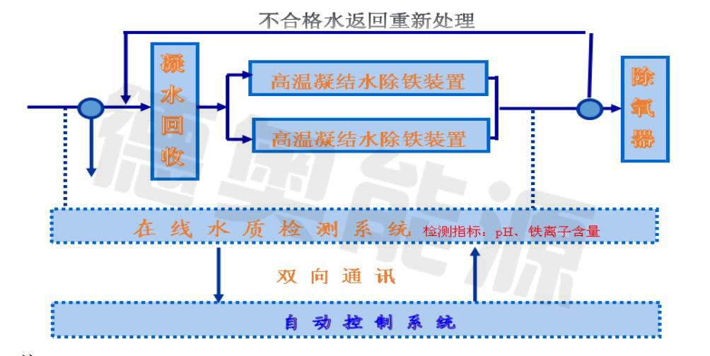 我公司可根據客戶的實際要求,在除鐵裝置的后端或者前后端水質在線檢測裝置,并通過電動閥的開啟自動執行處理后凝結水的去向。