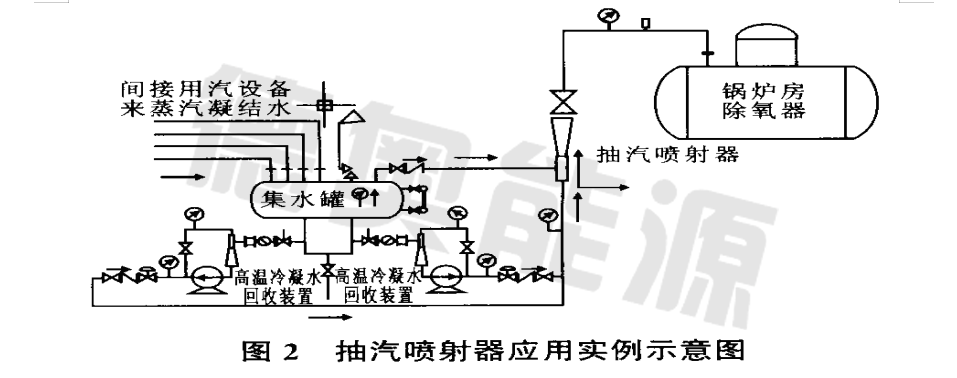 在實際使用中,抽汽噴射器根據不同的需要和工藝流程,具有幾種應用模式。圖2顯示了一個典型的應用工藝流程。